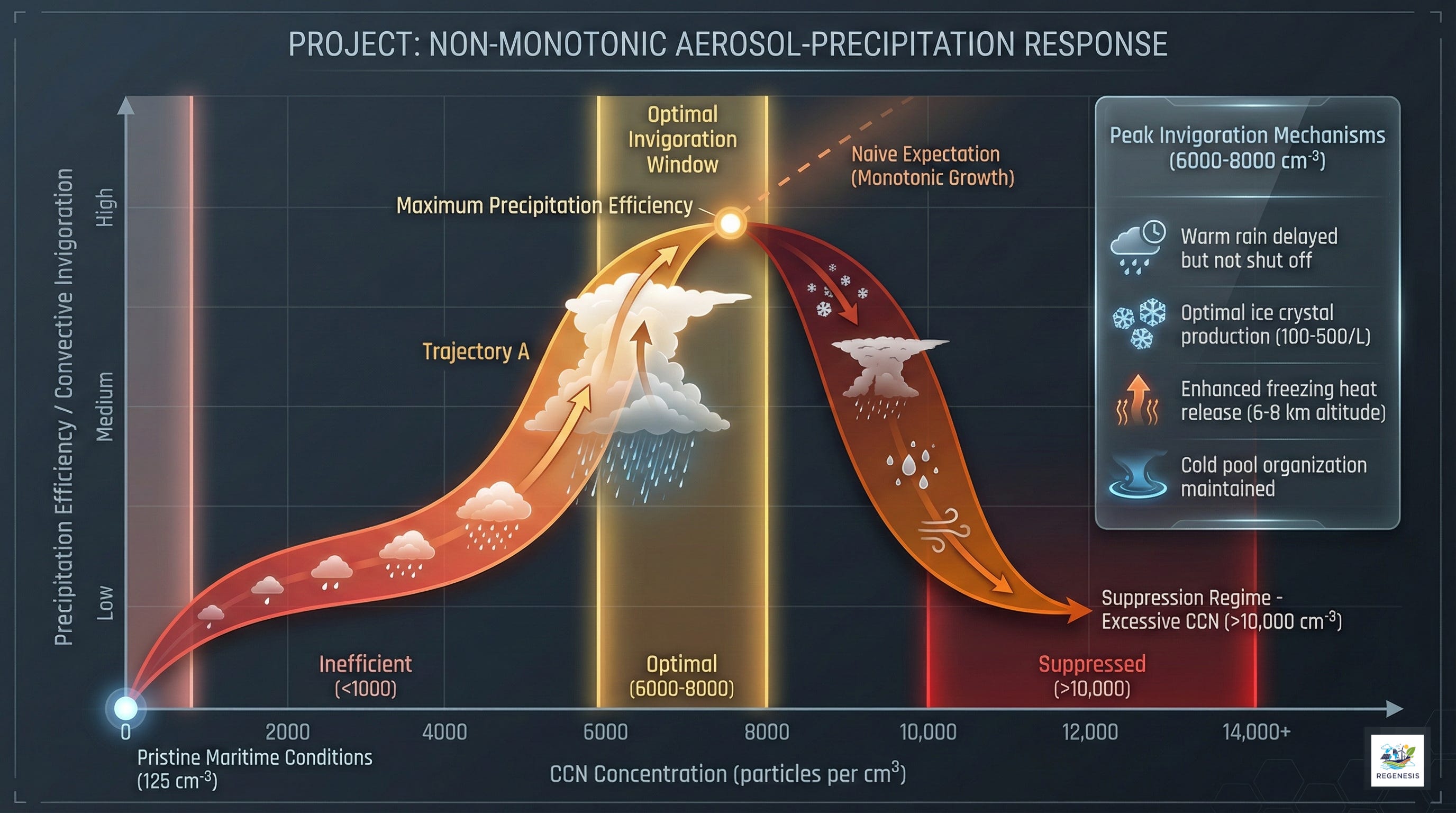 Understanding why reveals operational constraints that any serious discussion of precipitation modification, or climate repair through managing aerosol concentrations to restore or prevent precipitation changes (reducing pollution in suppressed regions to restore rainfall, or maintaining low concentrations in pristine areas to prevent unwanted storm invigoration), must address. It explains why Project STORMFURY produced inconclusive results despite years of effort and substantial funding. It demonstrates why hurricane seeding proposals based on simple “more aerosols = more invigoration” logic won’t work as advertised. And it shows that aerosol effects on precipitation operate through regime-dependent mechanisms with sharp transition points rather than smooth monotonic relationships.