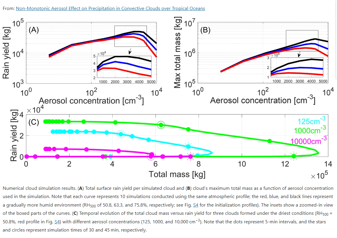 Cloud-resolving model simulations confirmed and explained this pattern. Runs with aerosol concentrations ranging from 5 to 10,000 cm⁻³ were conducted under idealized tropical thermodynamic profiles representing different humidity conditions. For each profile, total surface rain yield and maximum cloud mass showed clear peaks at intermediate concentrations rather than continuing to increase with aerosol loading (Liu et al., 2019).